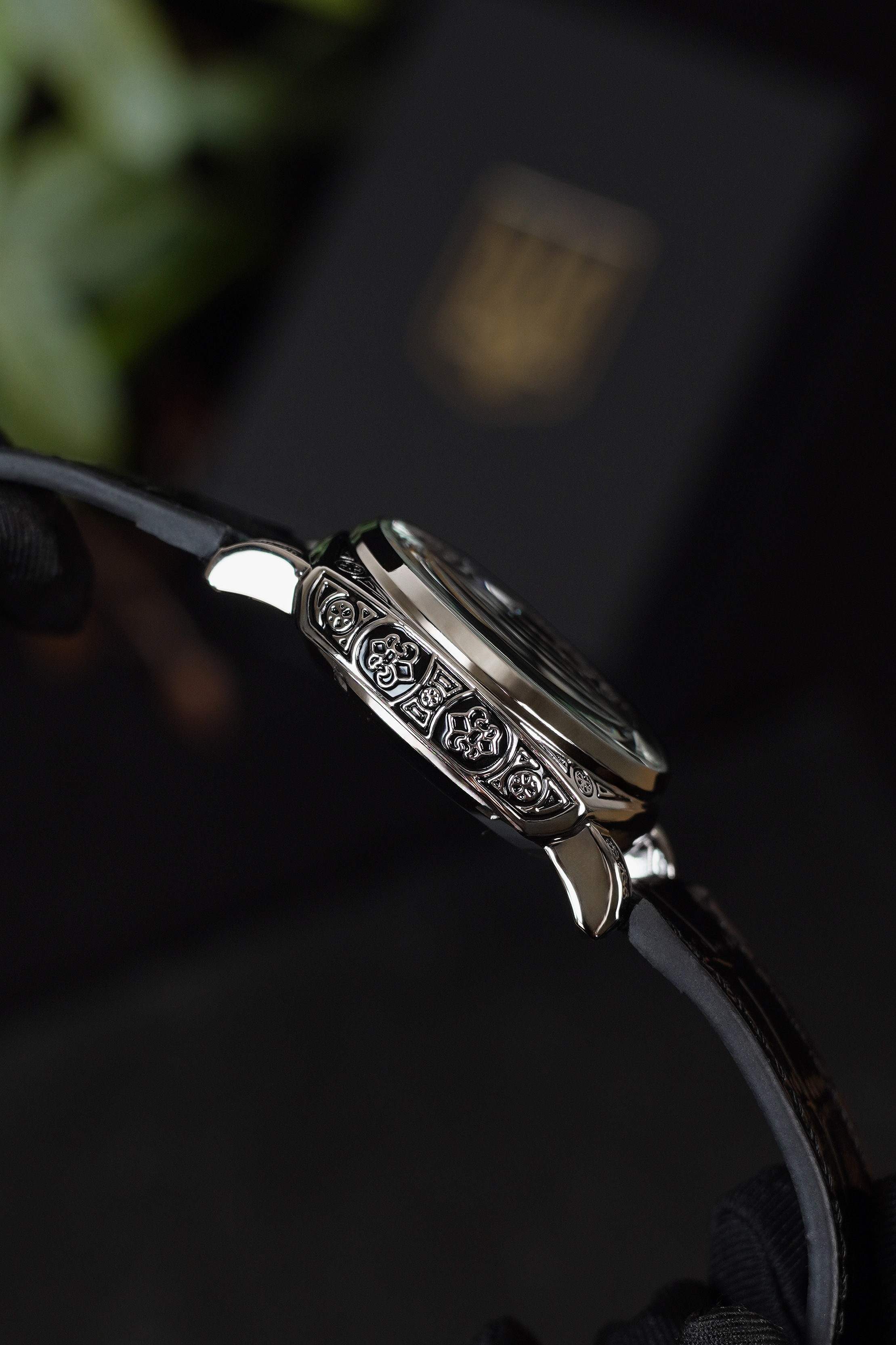 Серебристый корпус в сочетании с чёрным кожаным ремешком создаёт классический и уверенный образ.