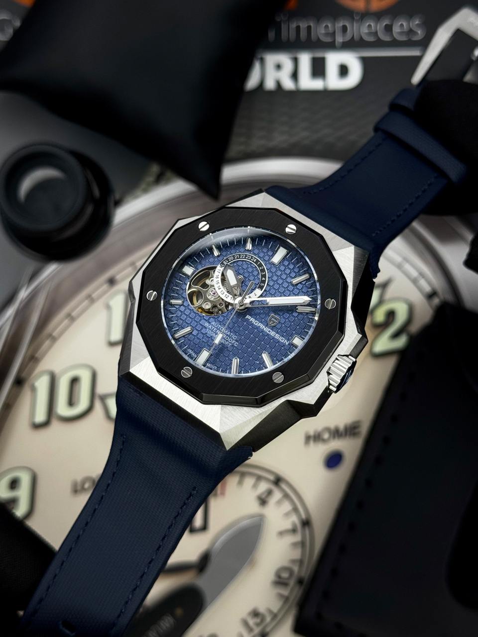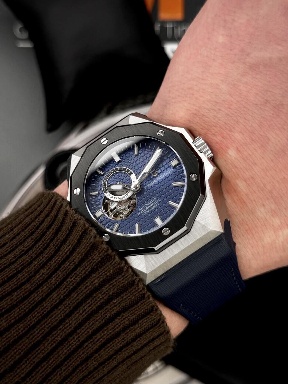 Pagani Design PD-YS010 Silver-Blue — это воплощение мужской элегантности и выдержанного стиля. Механический механизм без батареек работает от движения руки, а сочетание серебристого стального корпуса с синим кожаным ремешком создаёт гармоничный образ, подходящий как под деловой костюм, так и под casual. Сапфировое стекло защищает от царапин, а водозащита 100 м позволяет не снимать часы во время плавания или под дождём.