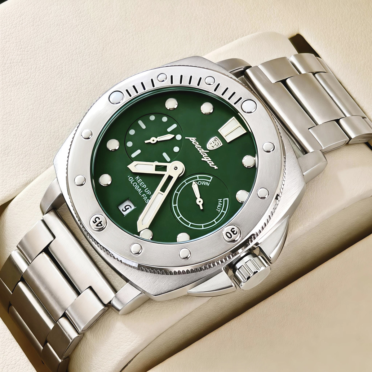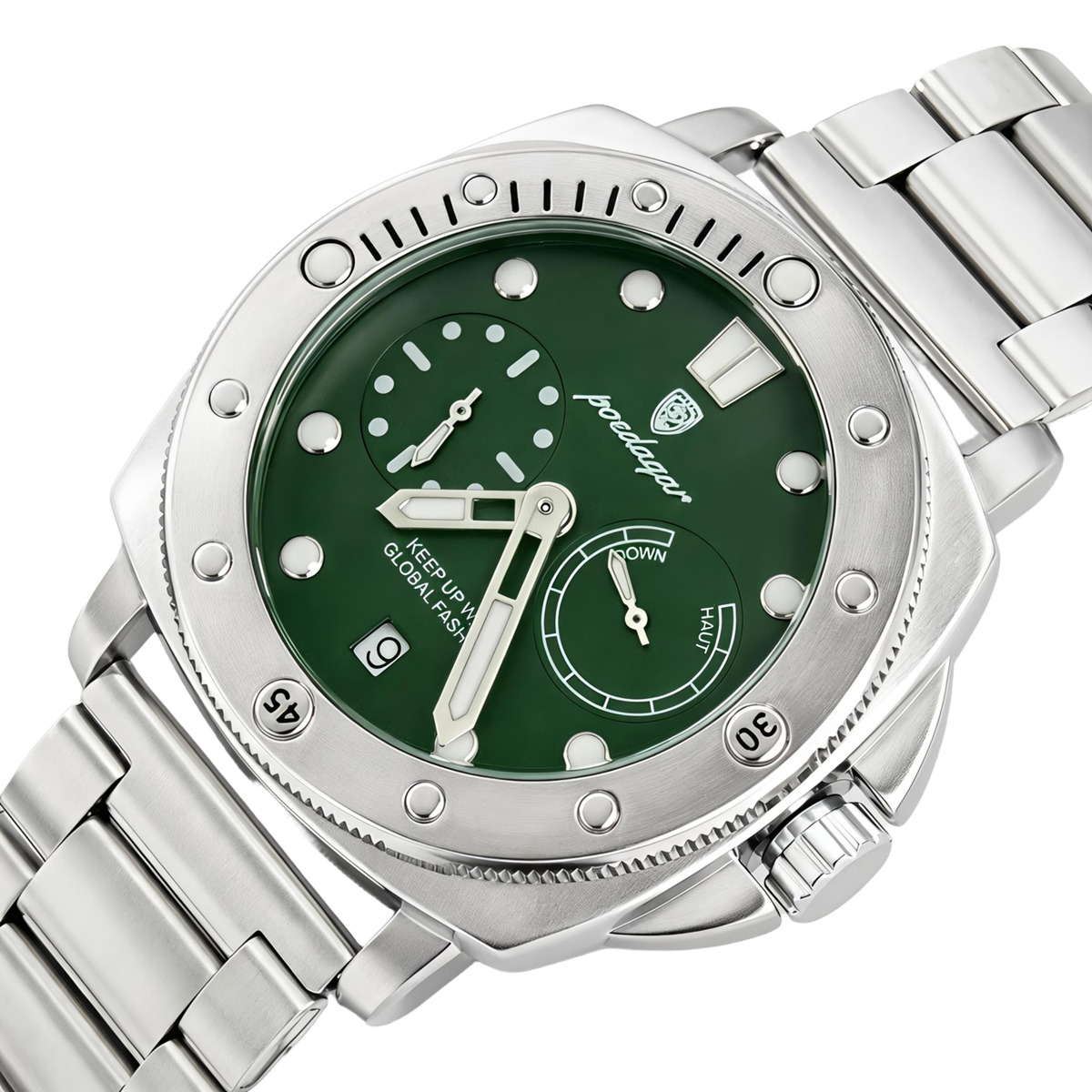 Poedagar – это сочетание элегантности, точности и современного стиля. Часы этого бренда предназначены для тех, кто ценит утонченность в деталях и стремится подчеркнуть свою индивидуальность.Каждая модель Poedagar – это:Качественные материалы: нержавеющая сталь, крепкое минеральное стекло, надежные кварцевые механизмы.Стильный дизайн: от классических решений до современных спортивных форм.Функциональность: водозащита, индикатор даты, светоотражающие стрелки и другие полезные функции.Poedagar – это идеальный выбор для деловых встреч, повседневного стиля или особых событий. Это не просто часы – это выражение вашего вкуса, уверенности и стиля.В комплекте идет официальная гарантия на 12 месяцев.Часы комплектуются 2 ремешками:Основной – нейлоновый зеленый;Дополнительный – серебристый металлический браслет.Купить Poedagar Select Silver Metal, 2 ремешка от производителя Poedagar недорого по цене 1 495 грн. Доставка Poedagar Select Silver Metal, 2 ремешка 2309 в Киев, Днепр, Одессу, Львов, Харьков, Винницу и другие регионы Украины по тарифам Новой Почты.