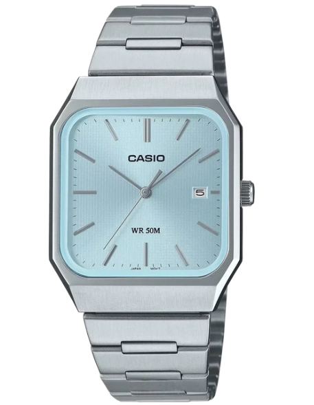 Casio MTP-B185D-2A2 — это стильные мужские часы в fashion-стиле с кварцевым механизмом, которые сочетают утончённый дизайн и практичность. Голубой циферблат, серебристый стальной корпус и браслет создают лёгкий и современный образ для города, офиса и мероприятий. Минеральное стекло защищает от царапин, а водозащита 50 WR не боится брызг и дождя.