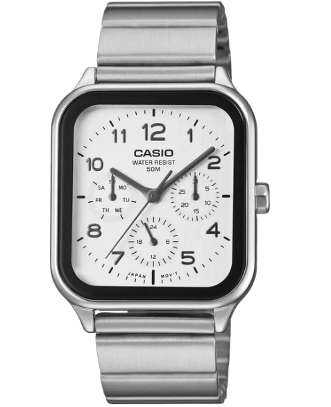 Casio MTP-M306D-7A — это стильные мужские часы в fashion-стиле с кварцевым механизмом. Серебристый корпус из нержавеющей стали, прямоугольная форма и белый циферблат с арабскими цифрами создают современный и аккуратный образ. Минеральное стекло защищает от царапин, а водозащита 50 WR позволяет не бояться дождя и брызг.