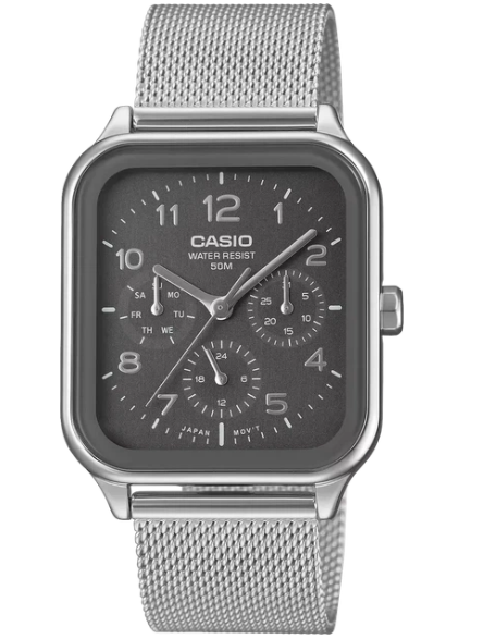 Casio MTP-M306M-8A — это стильные мужские часы в fashion-версии с кварцевым механизмом. Серебристый корпус из нержавеющей стали, прямоугольная форма и серый циферблат с арабскими цифрами создают сдержанный и современный образ. Минеральное стекло защищает от царапин, а водозащита 50 WR позволяет не переживать из-за дождя и брызг.