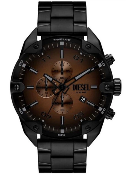 Черный стальной корпус и браслет в сочетании с коричневым циферблатом выглядят контрастно и статусно. Крупный размер подчеркивает стиль, а хронограф добавляет функциональности.