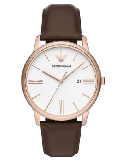Корпус цвета розового золота, белый циферблат с римскими цифрами и индексами и коричневый кожаный ремешок формируют элегантный образ, который отлично подходит для делового и повседневного стиля.