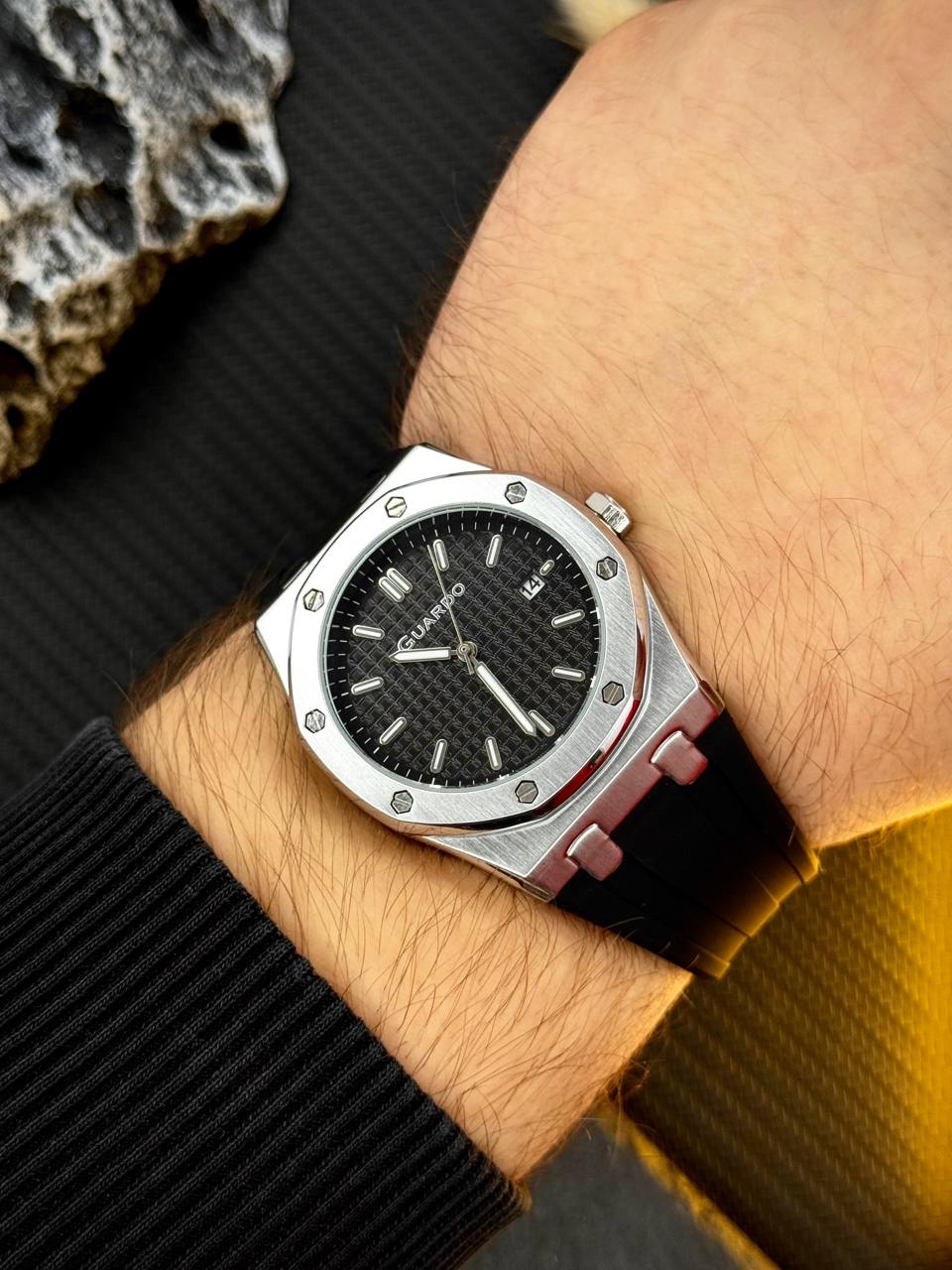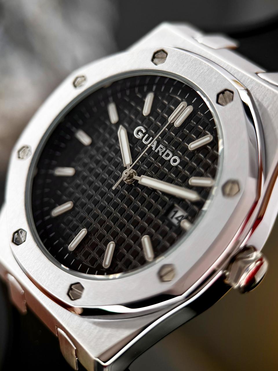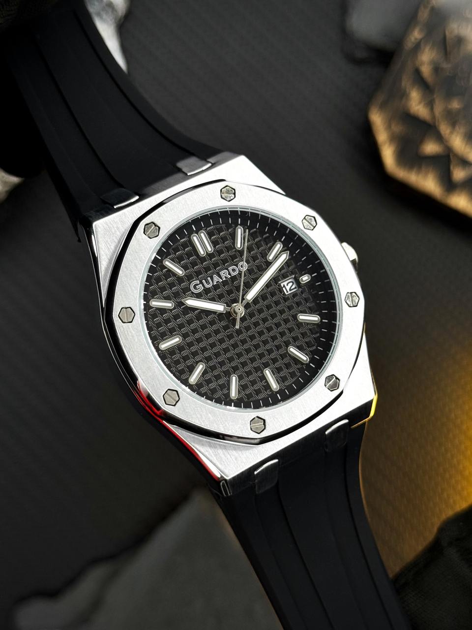 Guardo 012752-1 — элегантные мужские часы в классическом стиле для тех, кто ценит надёжность, простоту и современный дизайн. Серебристый корпус из нержавеющей стали и чёрный каучуковый ремешок создают стильный контраст, подходящий к любому образу — деловому или повседневному.