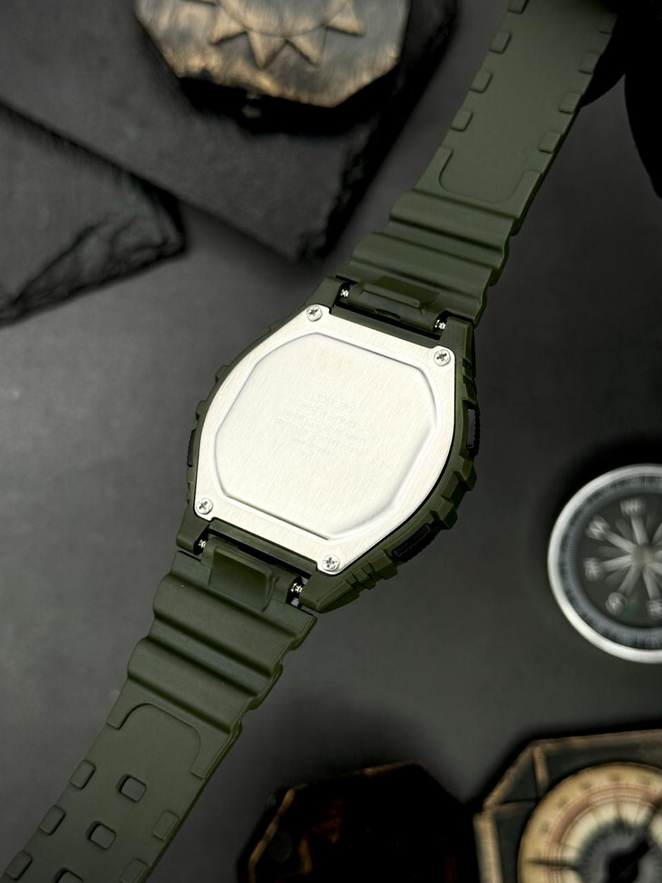 Темно-зелений корпус із полімеру та ремінець створюють сучасний динамічний образ, а електролюмінесцентне підсвічування дозволяє зручно читати час у темряві.