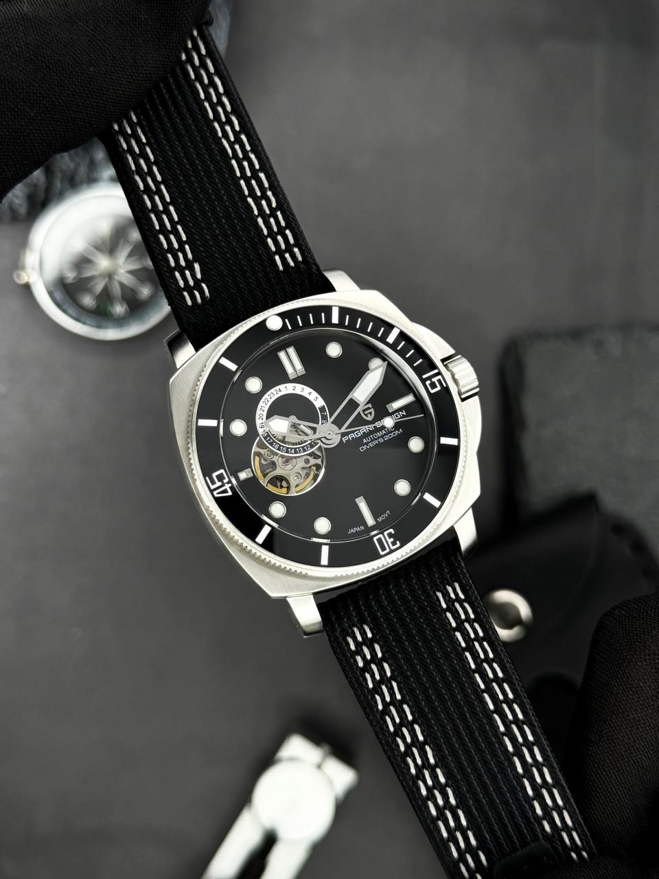 Pagani Design PD-1736 Silver-Black — чоловічий механічний годинник з автопідзаводом та водозахистом 200 м. Прямокутний сталевий корпус, чорний нейлоновий ремінець та стриманий циферблат роблять модель універсальною для щоденного та класичного стилю. Ідеальний варіант для тих, хто шукає надійну механіку без переплати.