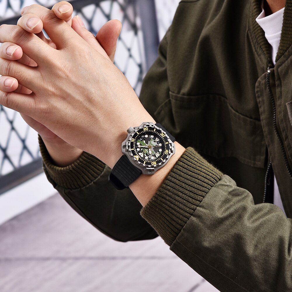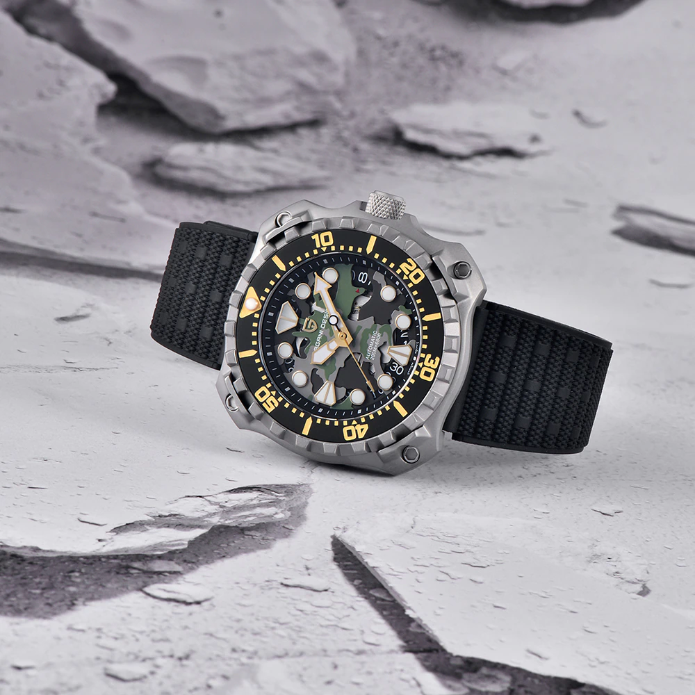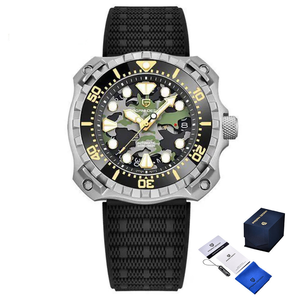 Годинники Pagani Design YN009 Silver-Camo — це стильний вибір для чоловіків, які цінують функціональність та сучасний дизайн. Виготовлені з нержавіючої сталі, ці годинники мають високий рівень водонепроникності до 100 метрів, що робить їх ідеальними для активного способу життя. Квадратний корпус сріблястого кольору в поєднанні з чорним гумовим ремінцем надає годиннику армійського стилю. Сапфірове скло забезпечує високий рівень захисту, а люмінесцентна підсвітка дозволяє зручно зчитувати час у темряві. Годинники обладнані механічним механізмом з автопідзаводом, мають функцію календаря та індикацію годин, хвилин, секунд і дати. Розміри годинника складають 43,3 х 40,7 мм, вагу — 116 г, а довжина та ширина ремінця становлять 24 та 22 мм відповідно. Гарантія на виріб — 12 місяців.Купити Pagani Design YN009 Silver-Camo від виробника Pagani Design недорого за ціною 5 840 грн. доставка Pagani Design YN009 Silver-Camo 1138-0031 в Київ, Дніпро, Одесу, Львів, Харків, Вінницю та інші регіони України за тарифами Нової Пошти.