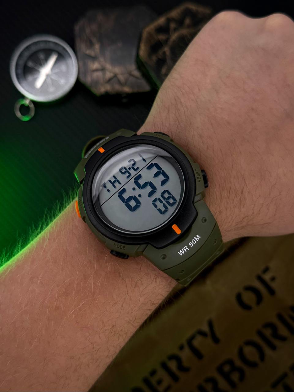 Skmei 1068 Army-Green — чоловічий електронний годинник у спортивному стилі, який поєднує легкість, функціональність і брутальний дизайн. Корпус діаметром 47 мм виготовлений із міцного полімеру, а зелений каучуковий ремінець забезпечує комфорт навіть під час активного використання.