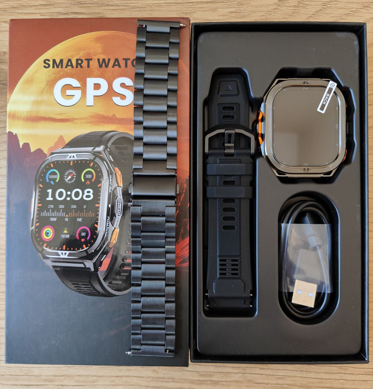 Комплектація | Коробочка, USB-зарядка, Інструкція, Товарний чек, Додатковий сталевий ремінець |