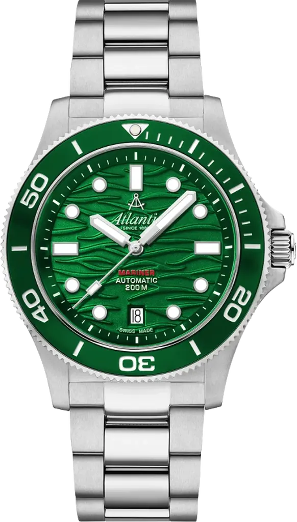 Atlantic Mariner Automatic 81776.41.79 — це чоловічий спортивний годинник із надійним швейцарським механізмом автопідзаводу та стильним дизайнерським акцентом у вигляді глибокого зеленого циферблату. Сріблястий сталевий корпус і браслет формують преміальний зовнішній вигляд, а сапфірове скло забезпечує максимальний захист від подряпин. Модель оснащена обертним безелем та високим рівнем водозахисту, що робить її універсальною як для повсякденного носіння, так і для активного відпочинку.