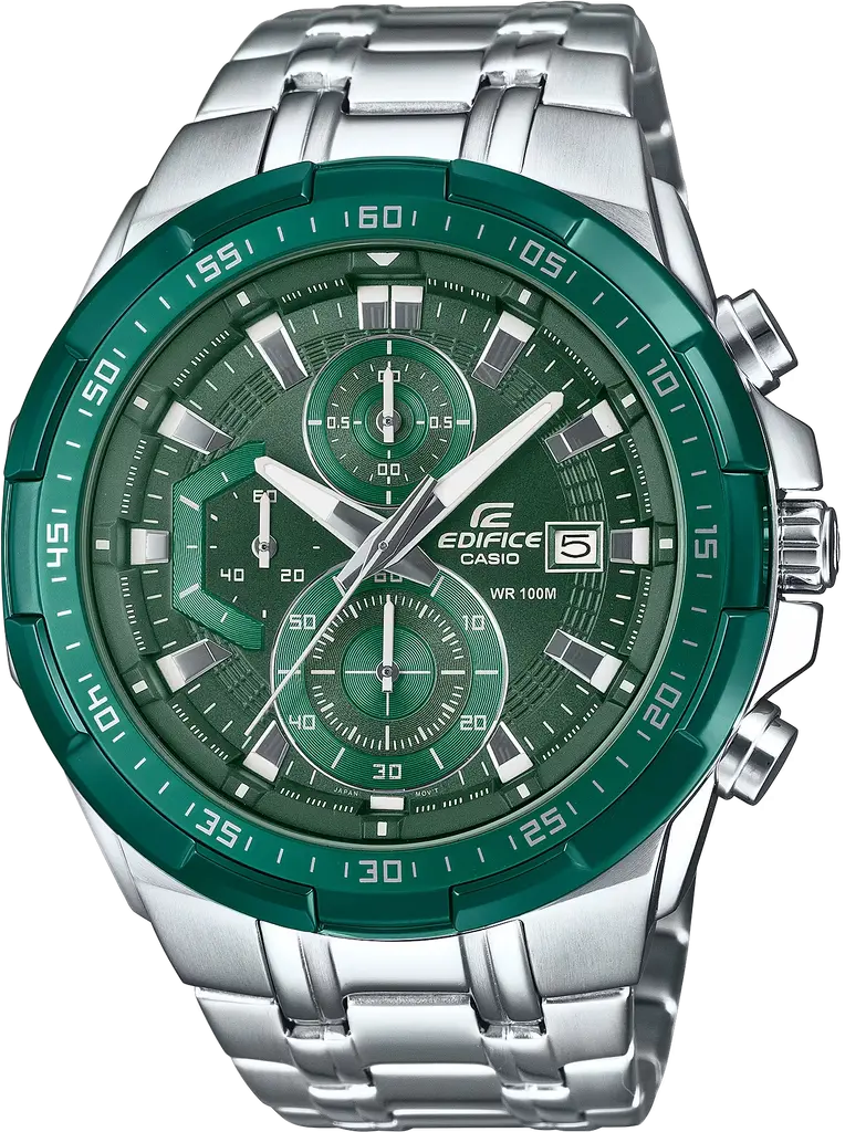 Casio EDIFICE Classic EFR-539DE-3AVUEF — чоловічий спортивний годинник із кварцовим механізмом, який поєднує стиль, функціональність і надійність. Сріблястий корпус і браслет із нержавіючої сталі створюють солідний вигляд, а зелений циферблат додає сучасного характеру.