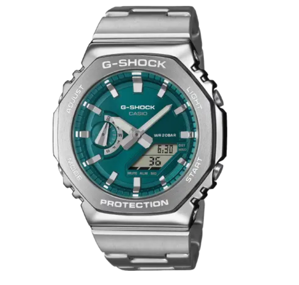 Зелений циферблат + сріблястий сталевий безель + сріблястий браслет формують потужний, сучасний образ у стилі G-Shock.
