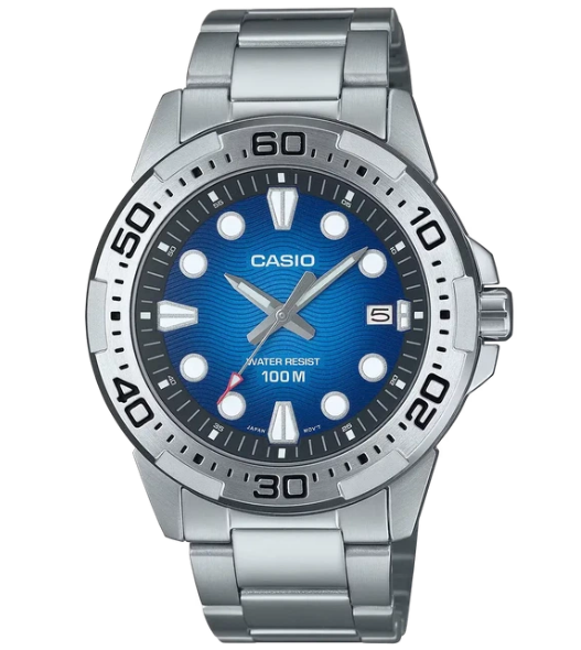 Casio MTD-140D-2A — це стильний чоловічий годинник з кварцовим механізмом, який поєднує спортивний характер і класичний дизайн. Синій циферблат у поєднанні зі сріблястим сталевим корпусом та браслетом створює універсальний образ — для роботи, відпочинку і активного життя. Мінеральне скло та водозахист 100 WR роблять модель практичною для щоденного носіння.