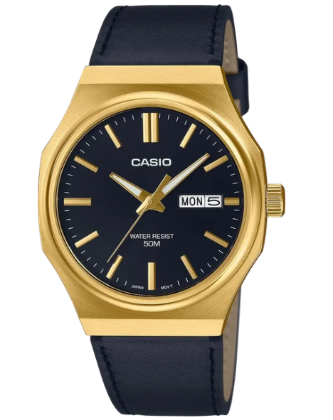 Casio MTP-E735GL-1A — це чоловічий fashion-годинник з кварцовим механізмом, що поєднує елегантність і практичність. Золотистий сталевий корпус, чорний циферблат і шкіряний ремінець створюють стильний класичний образ для офісу, подій і щоденного носіння. Мінеральне скло захищає від подряпин, а водозахист 50 WR дозволяє не хвилюватися за дощ чи бризки.