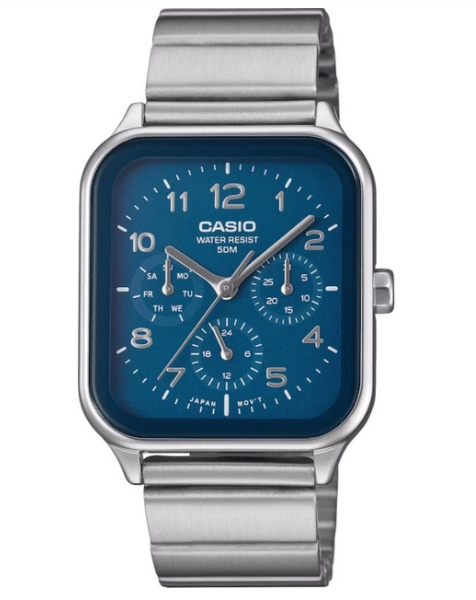 Casio MTP-M306D-2A — це стильний чоловічий годинник у fashion-форматі з кварцовим механізмом, який поєднує класичну елегантність і функціональність. Сріблястий корпус із нержавіючої сталі, синій циферблат з арабськими цифрами та сталевий браслет створюють виразний образ для роботи й повсякденного стилю. Мінеральне скло захищає від подряпин, а водозахист 50 WR дозволяє не хвилюватися під час дощу чи миття рук.
