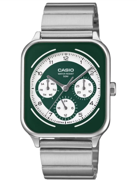 Casio MTP-M307D-3B — стильний чоловічий годинник у версії Fashion з кварцовим механізмом. Прямокутний сріблястий корпус із нержавіючої сталі поєднується з глибоким зеленим циферблатом та арабськими цифрами. Мінеральне скло стійке до подряпин, а водозахист 50 WR підходить для щоденного носіння.