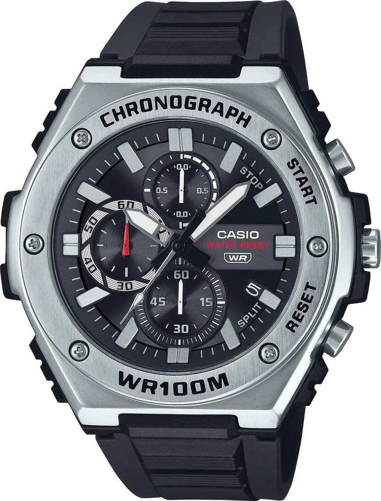 Акрилове скло захищає від подряпин, а водозахист 100 WR дозволяє використовувати годинник під час плавання та тренувань. Хронограф і функція індикації дати додають практичності у щоденному використанні.