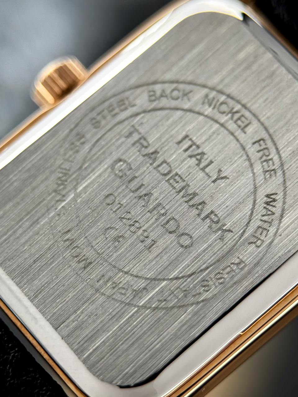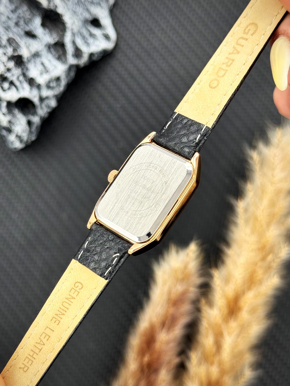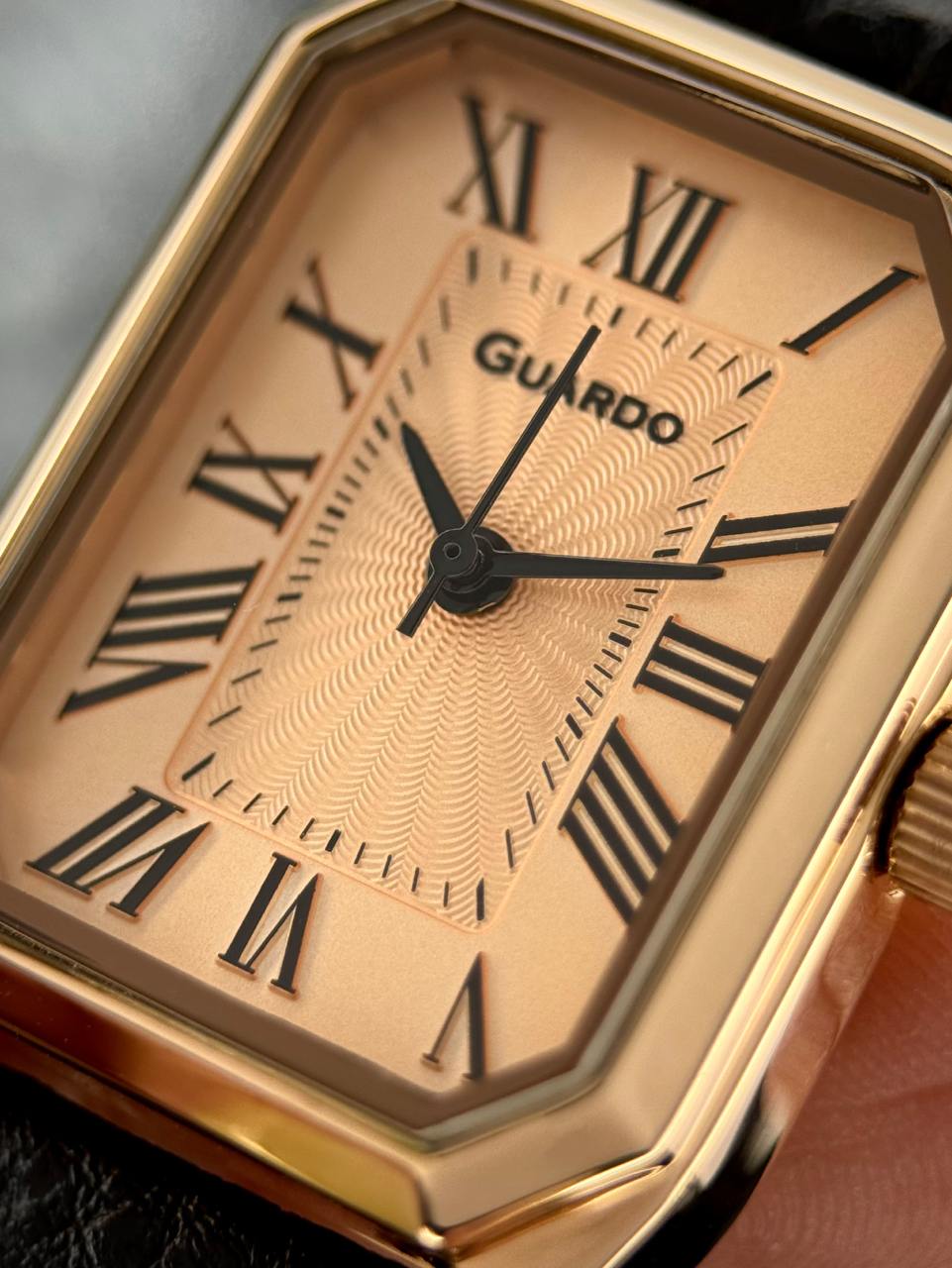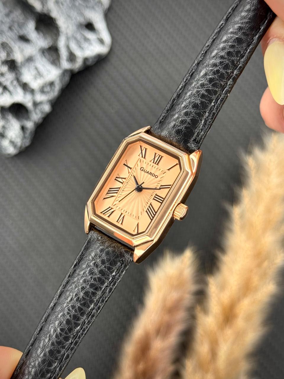 Guardo 012831-5 — це стильний годинник, що поєднує класичний дизайн та сучасну точність. Прямокутний корпус рожевого кольору з нержавіючої сталі, чорний шкіряний ремінець і витончений циферблат із римськими цифрами створюють образ впевненого та стильного чоловіка.
