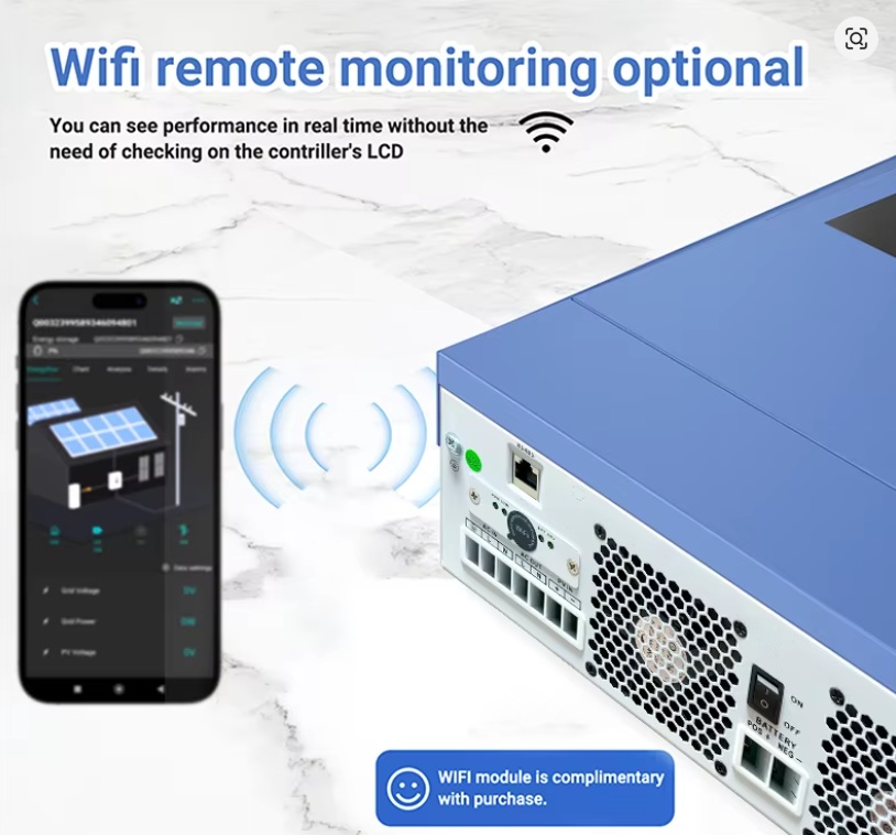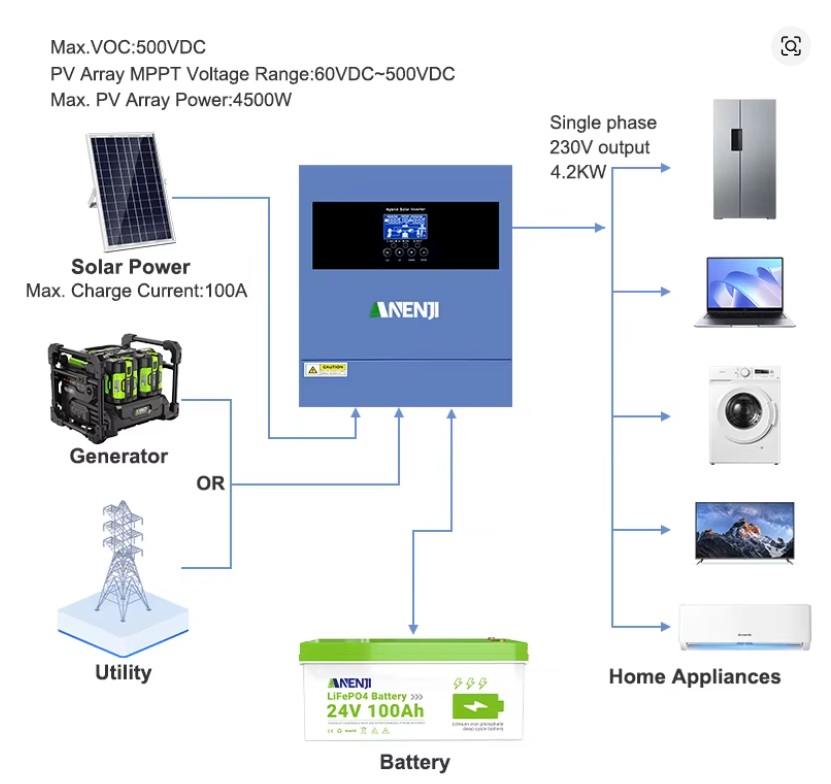 ANENJI 4.2 kW — потужний гібридний сонячний інвертор нового покоління, який поєднує функції мережевого інвертора, контролера заряду MPPT і безперебійного джерела живлення. Цей пристрій перетворює енергію сонячних панелей у стабільну електрику для будинку або офісу та автоматично перемикається між джерелами живлення — сонячною енергією, батареями та електромережею. Вбудований Wi-Fi забезпечує віддалений моніторинг і зручне управління через смартфон.