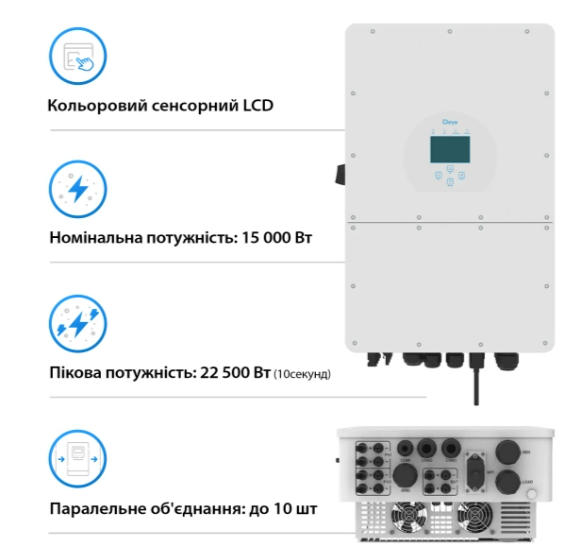 DEYE SUN-15K-SG01HP3-EU-AM2 — ідеальний вибір для тих, хто будує потужну сонячну систему та хоче максимальну ефективність і автономність.