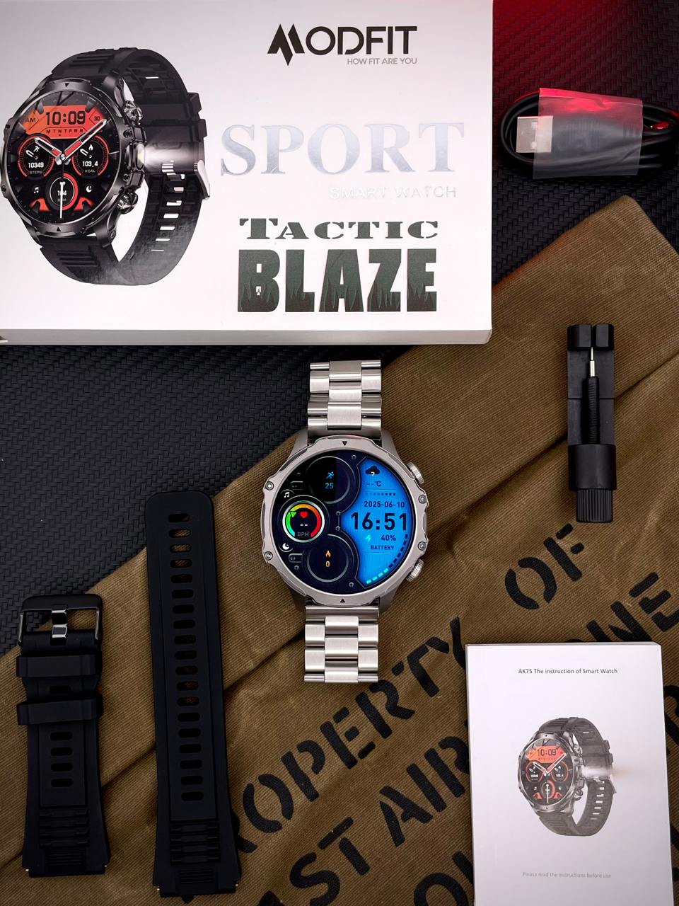 Розумний годинник Modfit Tactic Blaze — це сучасний смарт-годинник, який поєднує в собі стильний дизайн та багатий функціонал, створений для активних людей, які прагнуть контролювати своє здоров'я та залишатися на зв'язку.