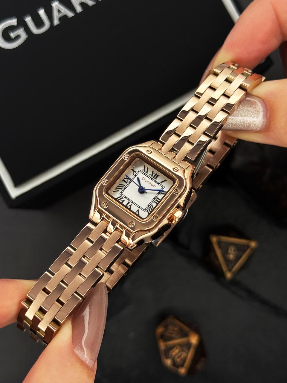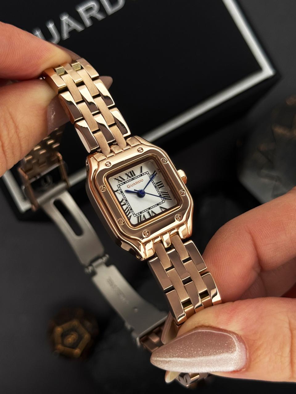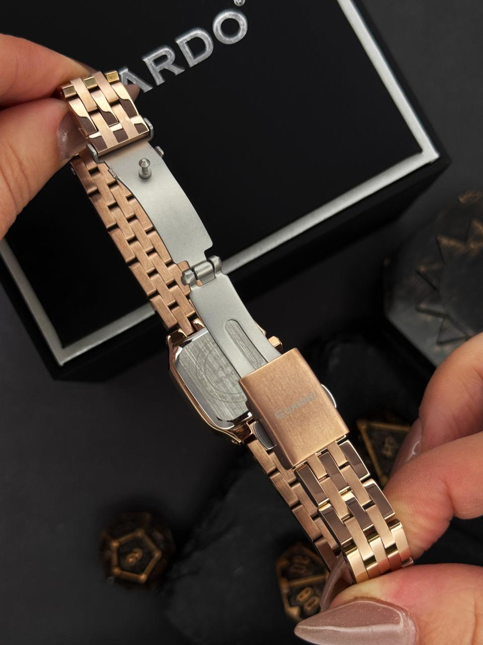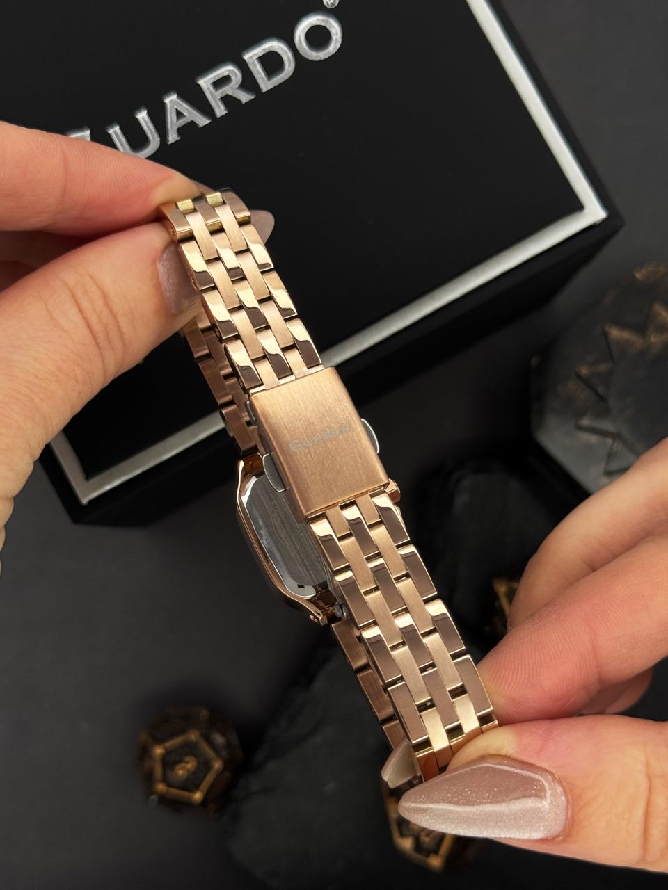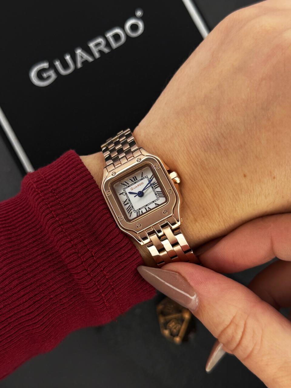 GUARDO 012827-4 — это элегантные женские часы в классическом стиле. Квадратный корпус розового цвета, стальной браслет и циферблат с римскими цифрами делают модель аккуратным и утончённым аксессуаром для повседневного образа и особых случаев.